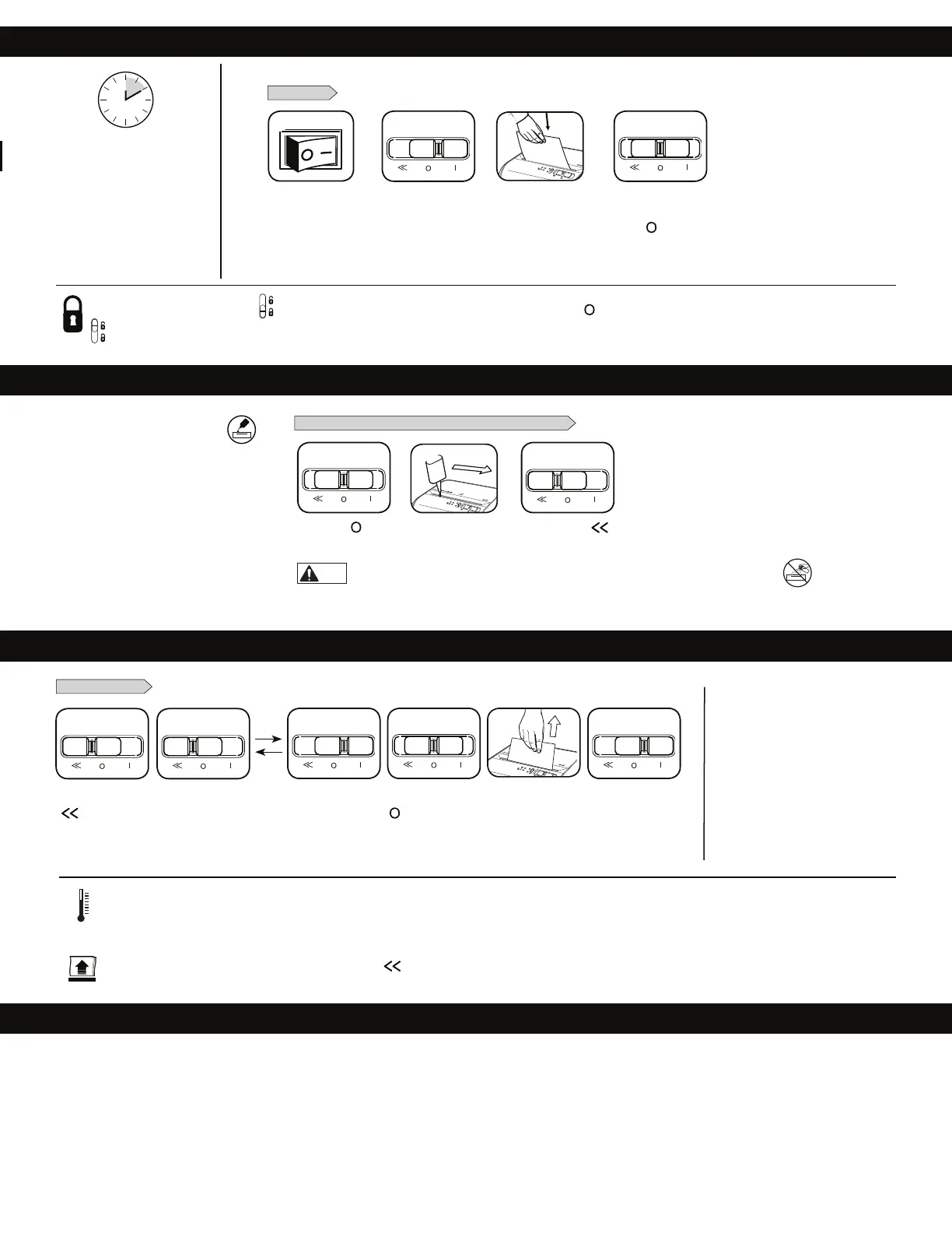For å låse opp føres den svarte knappen opp. For mer sikkerhet, trekk alltid ut støpselet til makuleringsmaskinen etter bruk.