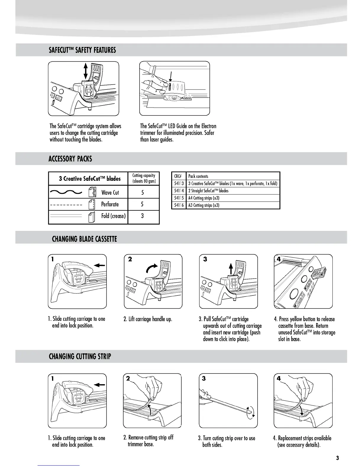 Fellowes Neutron - SAFECUTT SAFETY FEATURES; ACCESSORY PACKS; CHANGING BLADE CASSETTE; CHANGING CUTTING STRIP