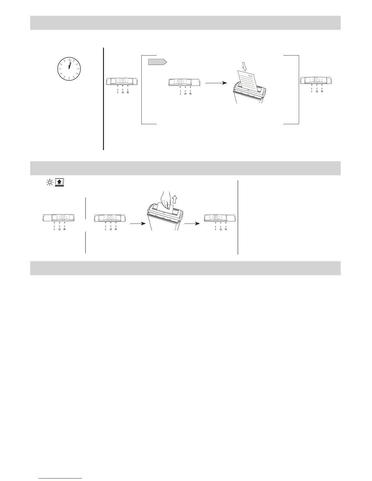 Paper jam: Set to Off (O), lift head and empty bin. Replace head on bin and follow any or