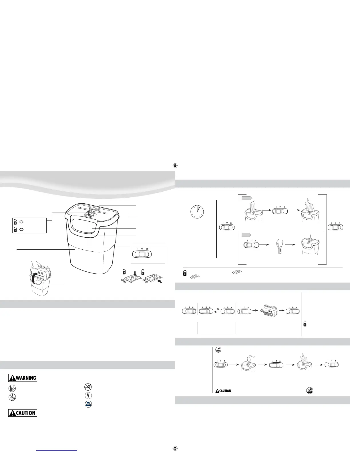 Paper jam: Set to Off (O), remove shredder head and empty bin. Replace shredder head, and follow any or