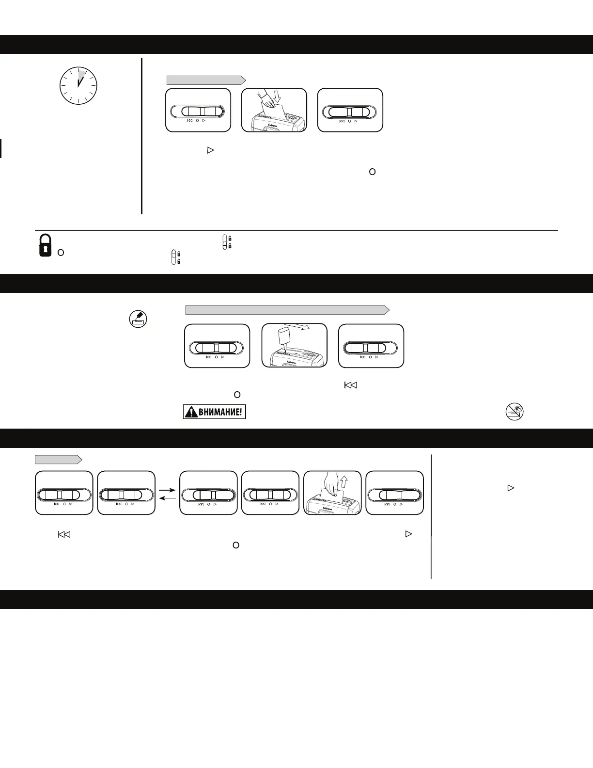 ), затем передвиньте черную кнопку вниз. Для отпирания переместите черную кнопку вверх. Для большей безопасности всегда выключайте уничтожитель из розетки