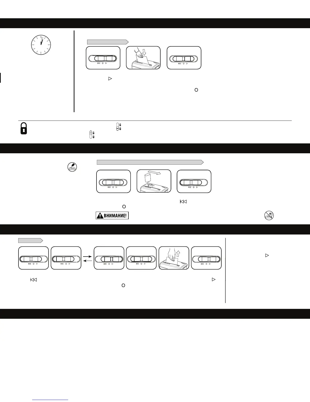 (O), затем передвиньте черную кнопку вниз. Для отпирания переместите черную кнопку вверх. Для большей безопасности всегда выключайте уничтожитель из розетки