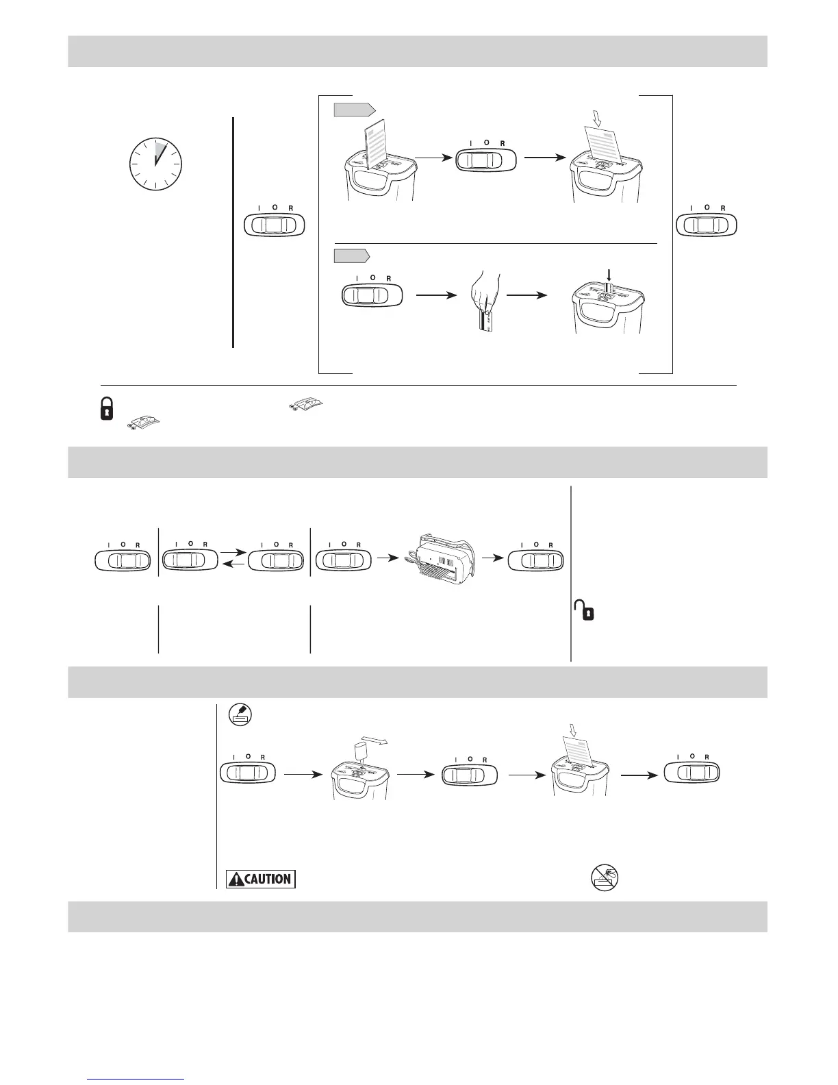 Paper jam: Set to Off (O), remove shredder head and empty bin. Replace shredder head, and follow any or