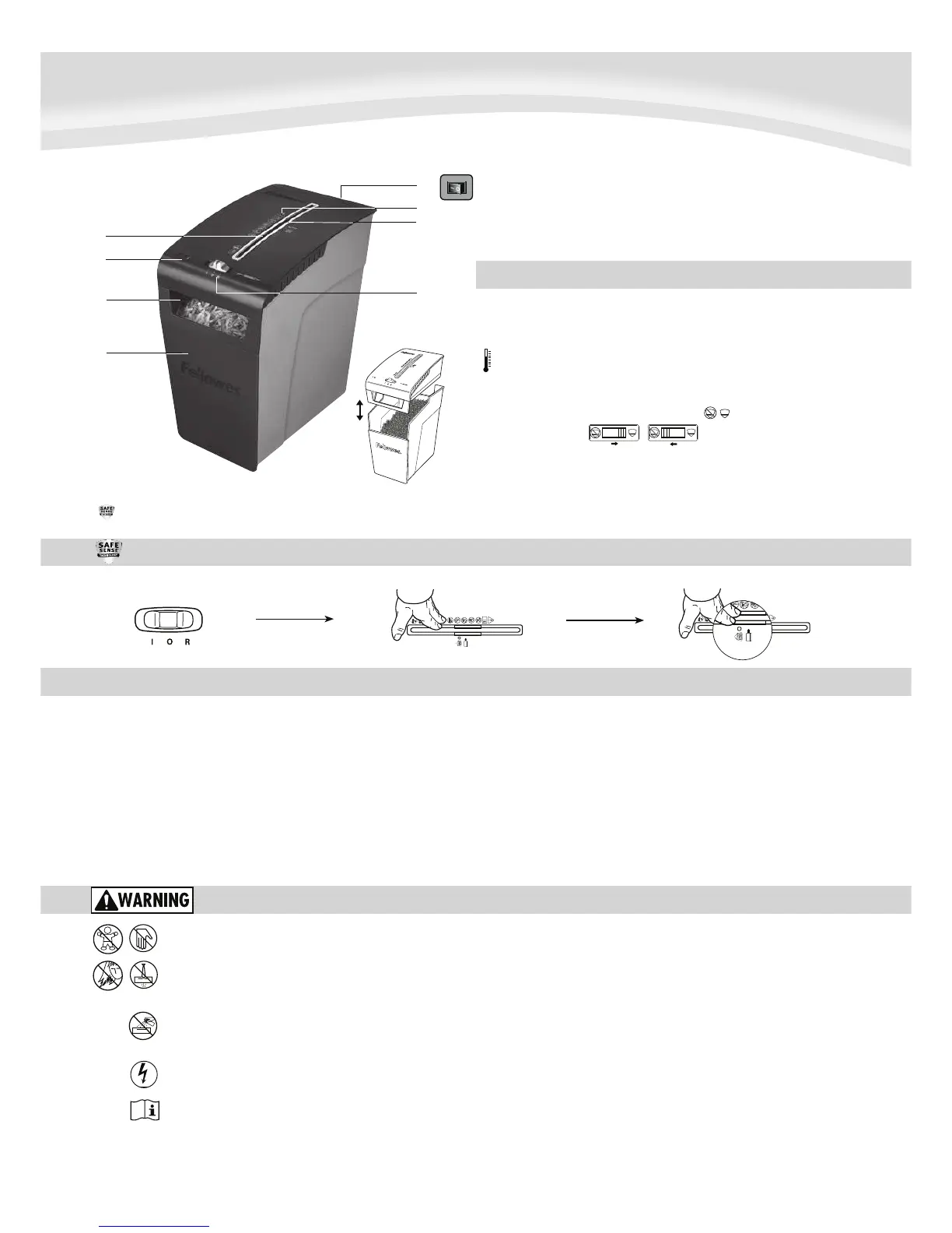 UÊShredder must be plugged into a wall outlet or socket of the voltage and