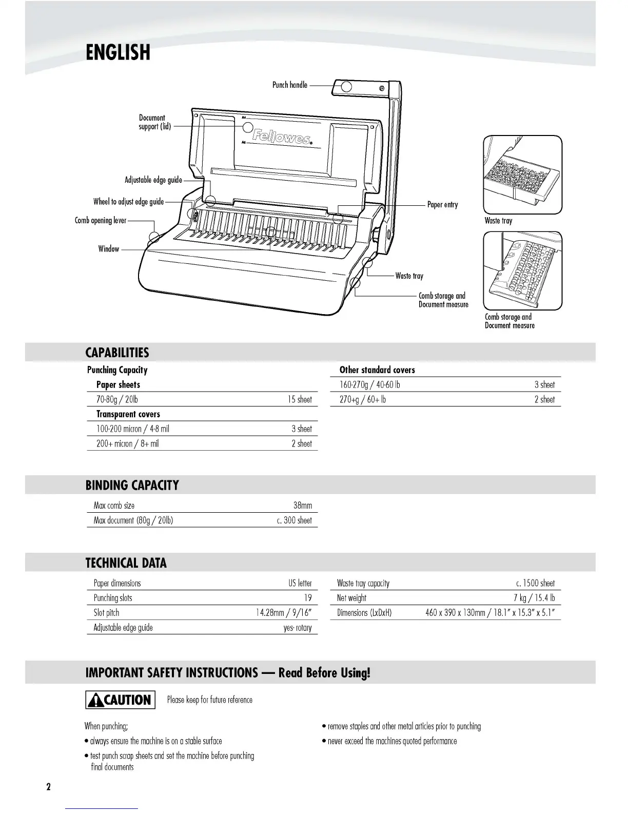 Fellowes Pulsar 300 - Capabilities; Punching Capacity; Binding Capacity; Max Comb Size