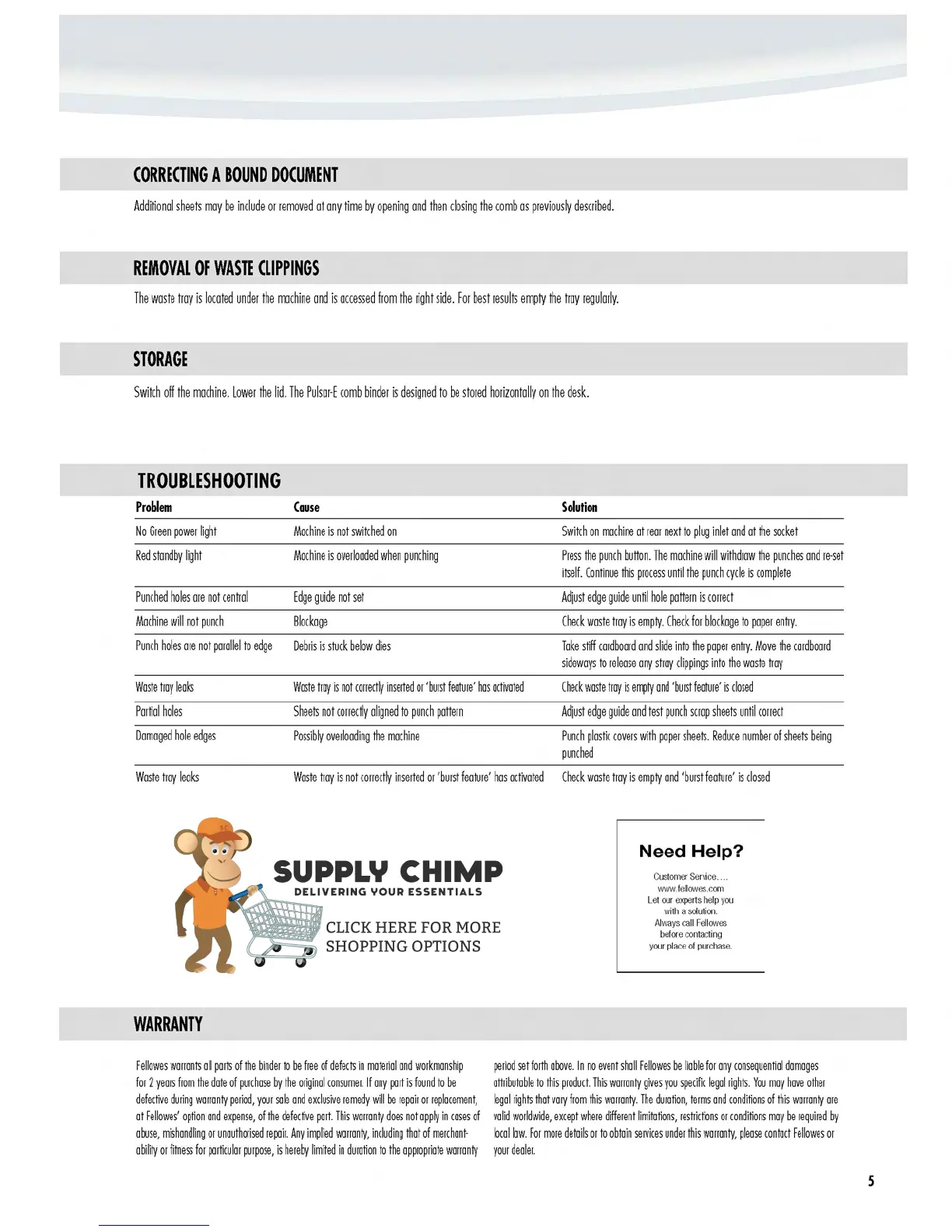 Fellowes Pulsar E 300 - Troubleshooting and Maintenance; Correcting a Bound Document; Waste Clipping Removal and Storage; Common Problems and Solutions