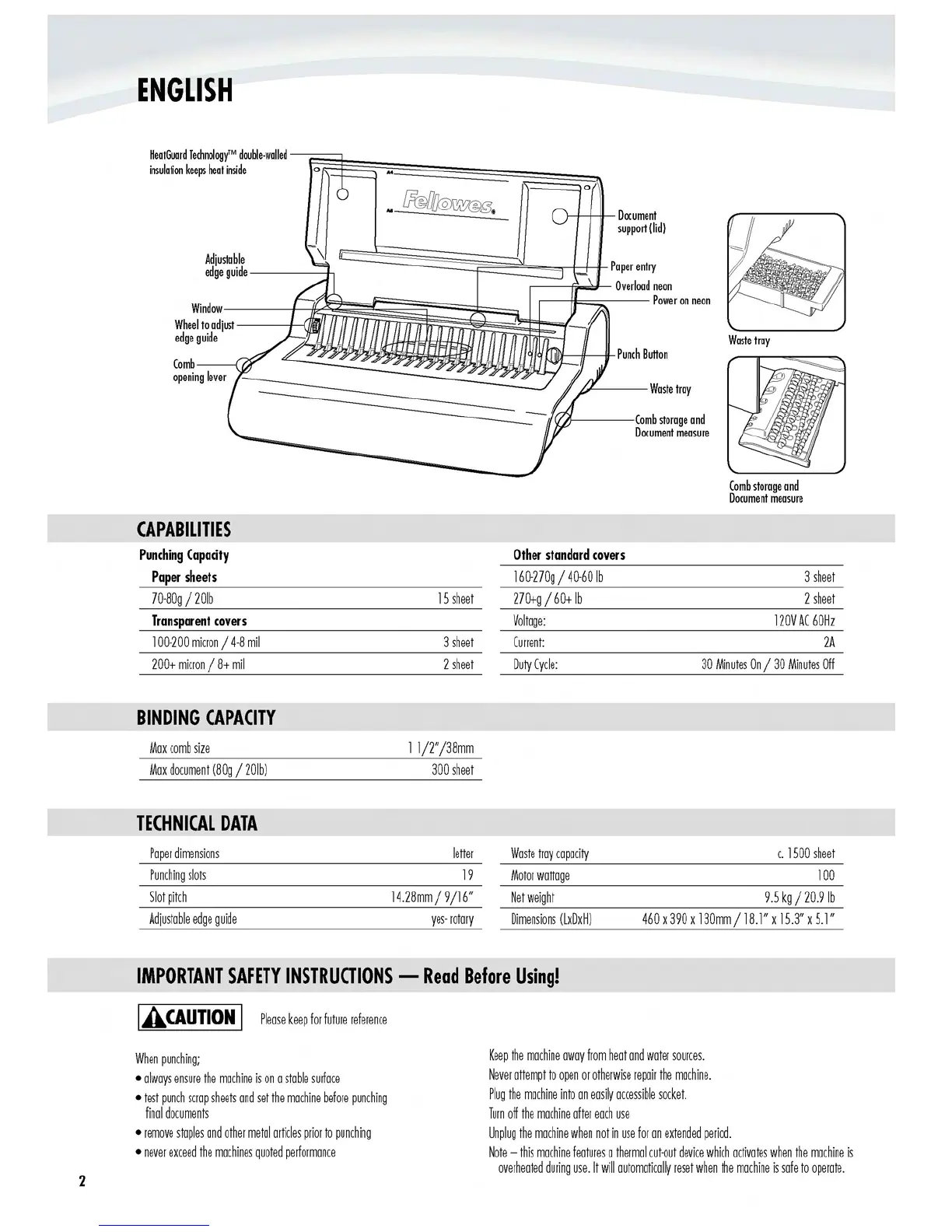 Fellowes Pulsar E 300 - Product Capabilities; Punching Capacity; Binding Capacity; Technical Data
