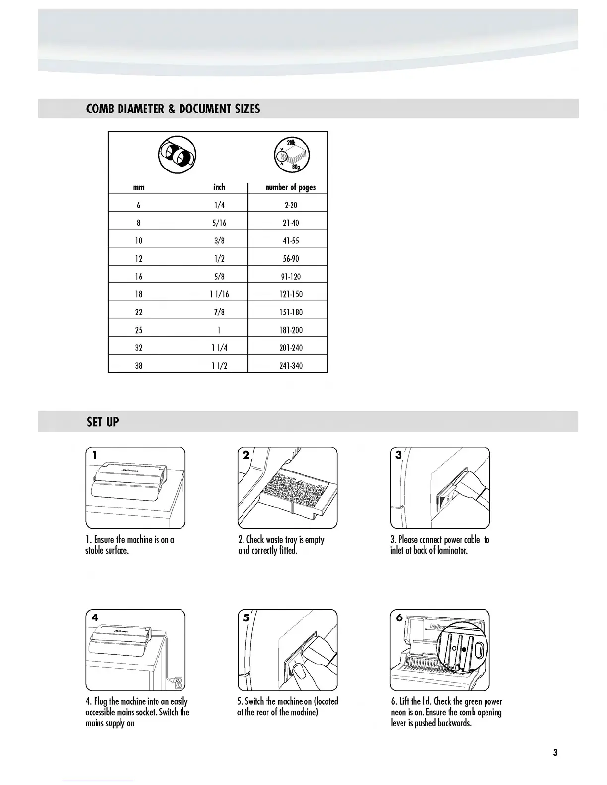 Fellowes Pulsar E 300 - Comb Diameter and Document Sizes; Setup Procedure; Initial Setup Steps