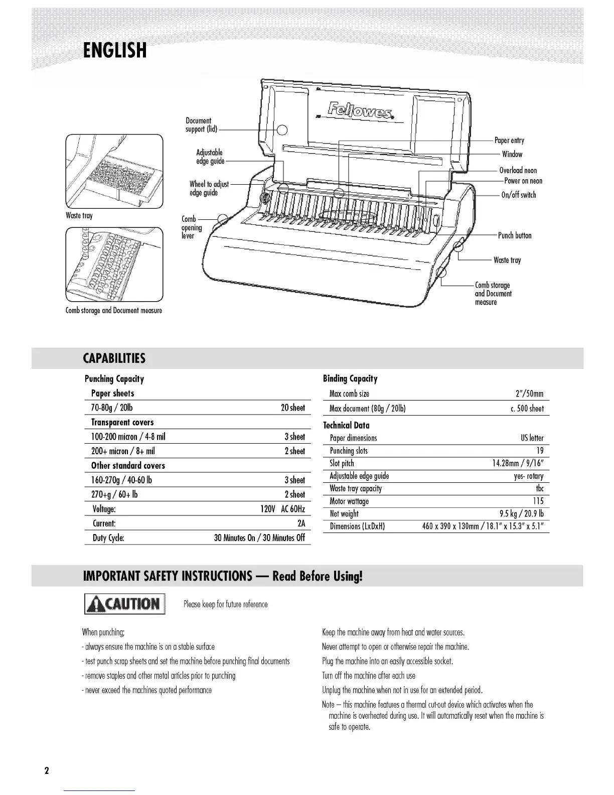 Fellowes Quasar E 500 - Important Safety Instructions; When Punching Safety; General Machine Safety