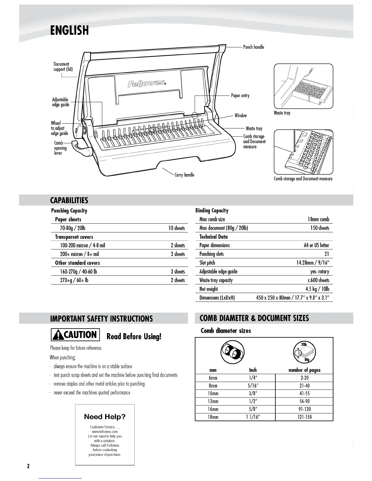 Fellowes Star 150 - Product Capabilities; Punching Capacity; Binding Capacity; Technical Specifications