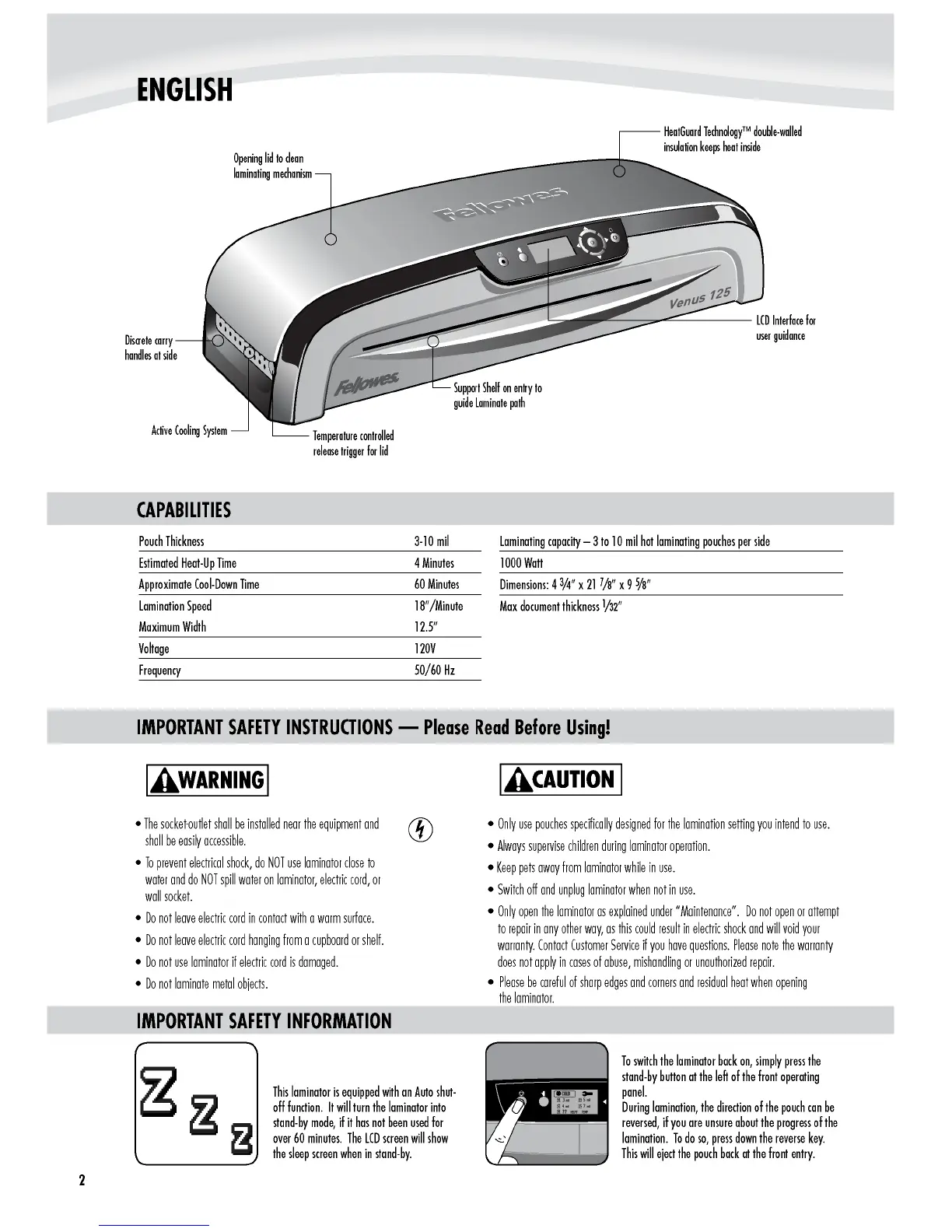 Fellowes Venus 125 - Capabilities; Important Safety Information; Auto Shut-off Feature; Operation Controls and Reversing