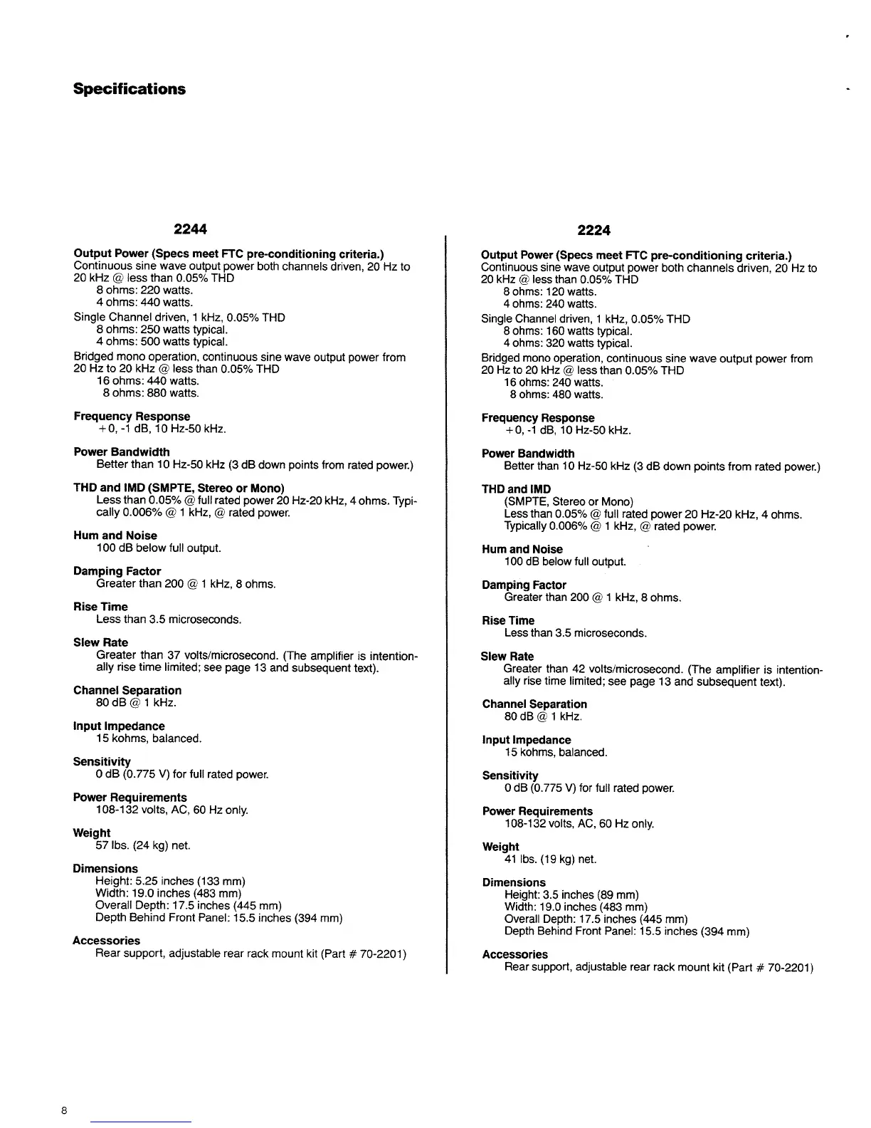 Fender 2224 - Specifications; 2244 Amplifier Specifications; 2224 Amplifier Specifications