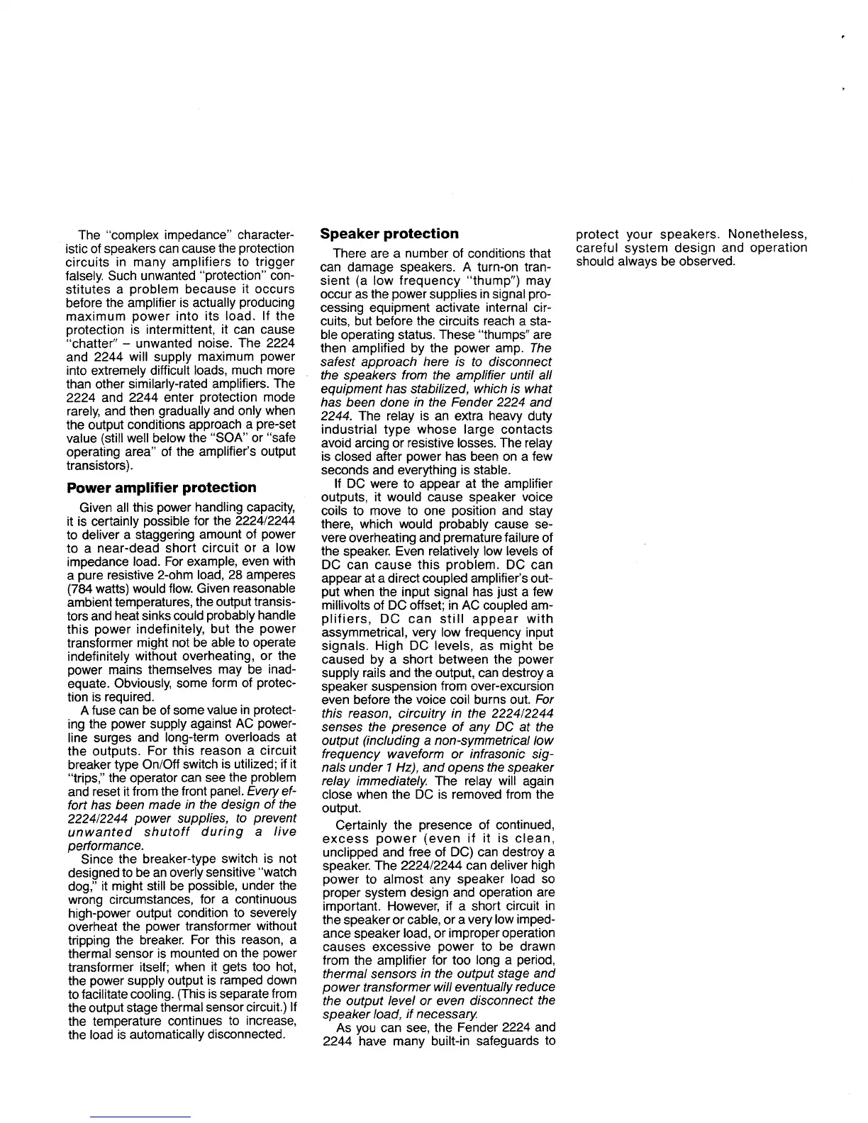 Fender 2224 - Power Amplifier Protection Features; Protection Mechanisms: Fuses, Relays, and Sensors; Speaker Protection Features; Protecting Speakers from Transients and DC Offset
