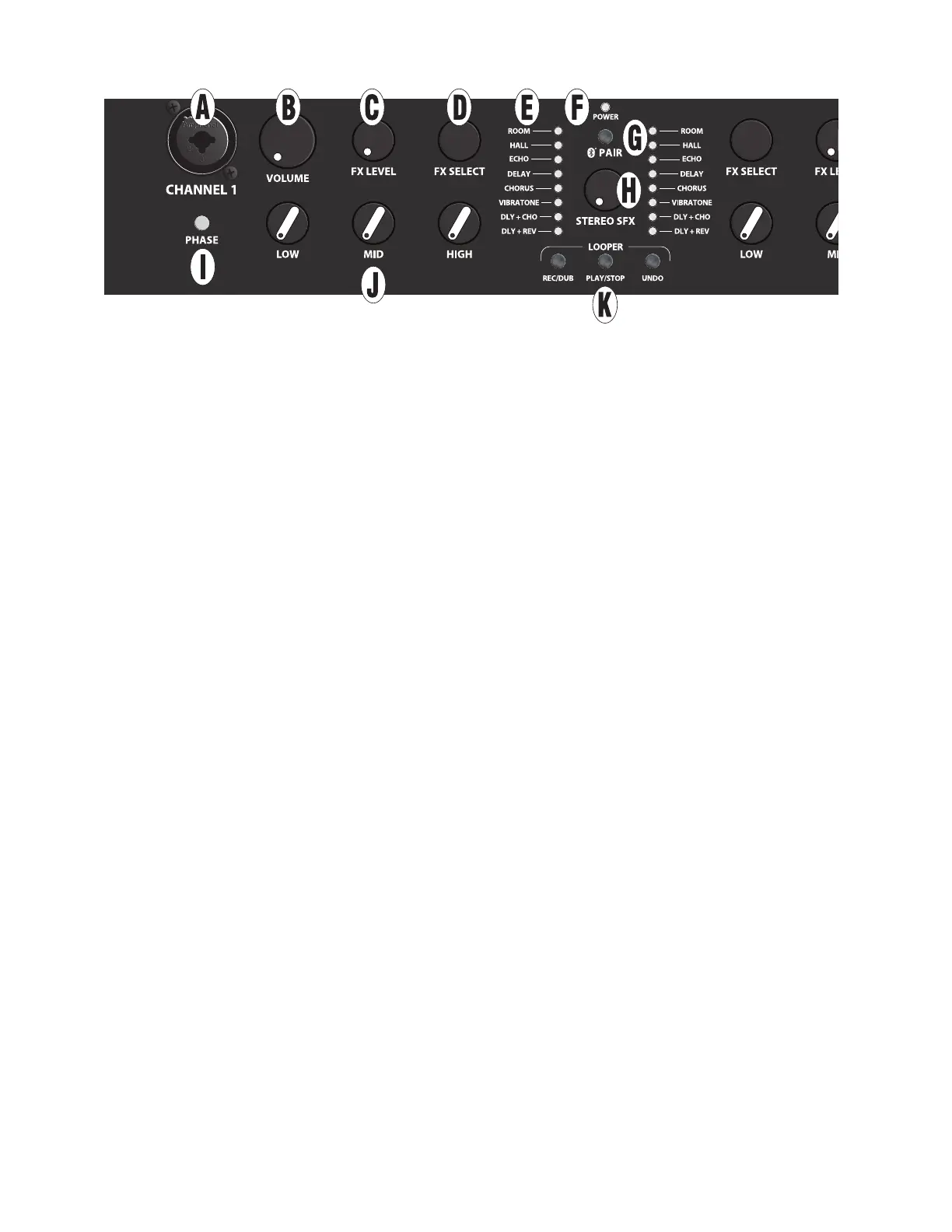 D. FX SELECT : Bouton de sélection de l’eet désiré parmi les eets disponibles suivants : réverbération d’une pièce