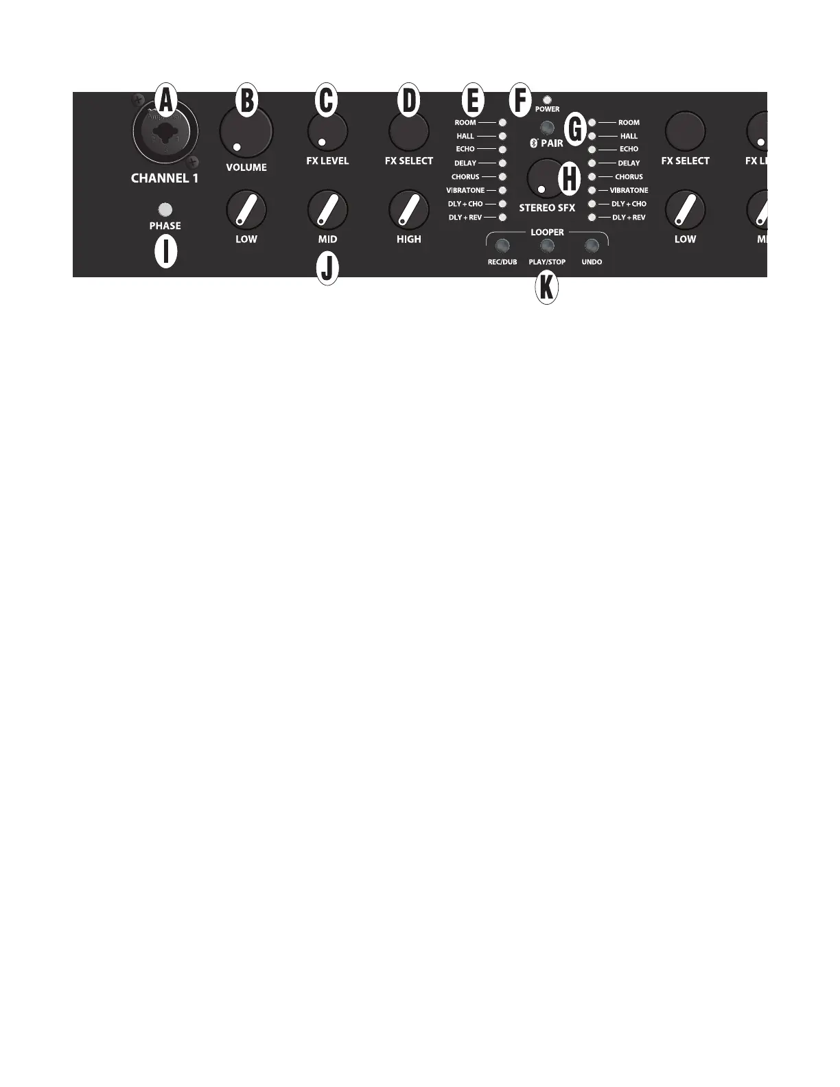 K. BOTÕES LOOPER (REC/DUB, PLAY/STOP, UNDO): Funções de gravação/overdubbing, reprodução/åparada e desfazer.