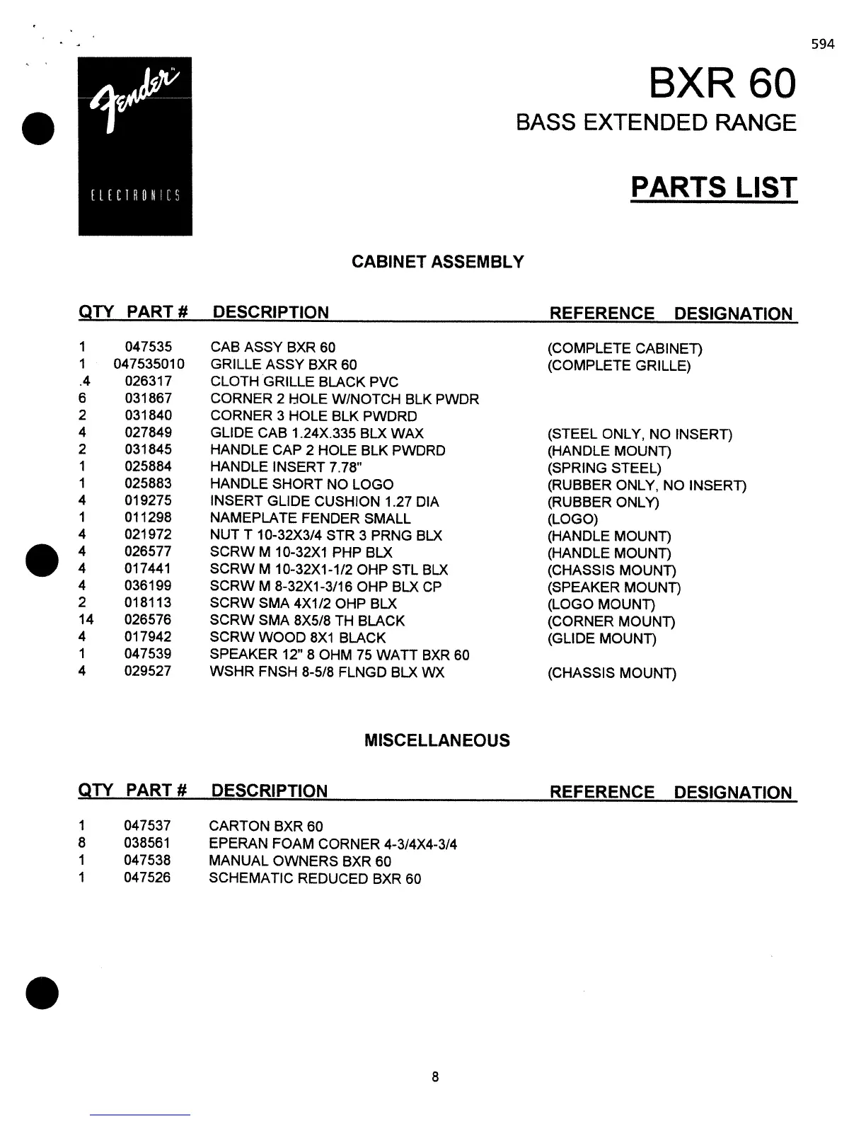 Fender BXR 60 - Cabinet Assembly; Miscellaneous