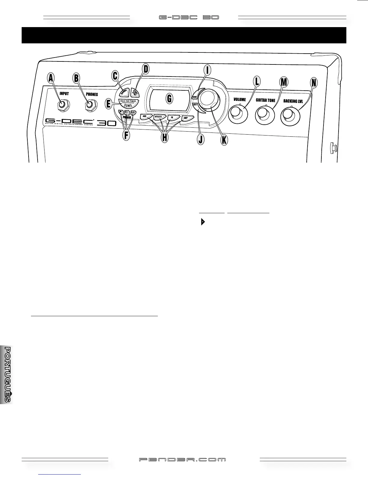 A. INPUT (entrada)—Conecte sua guitarra aqui.