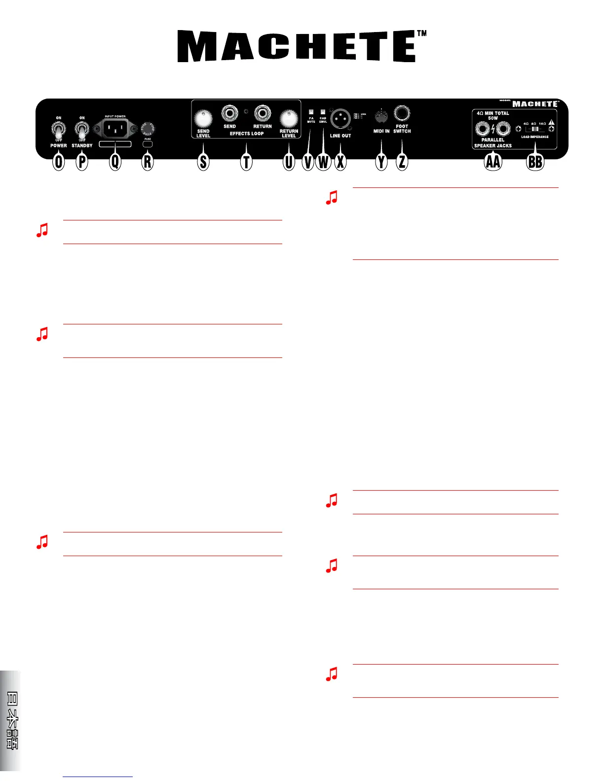 O. 電源スイッチ — アンプの電源をオンにするには、スイッチを "ON"の位