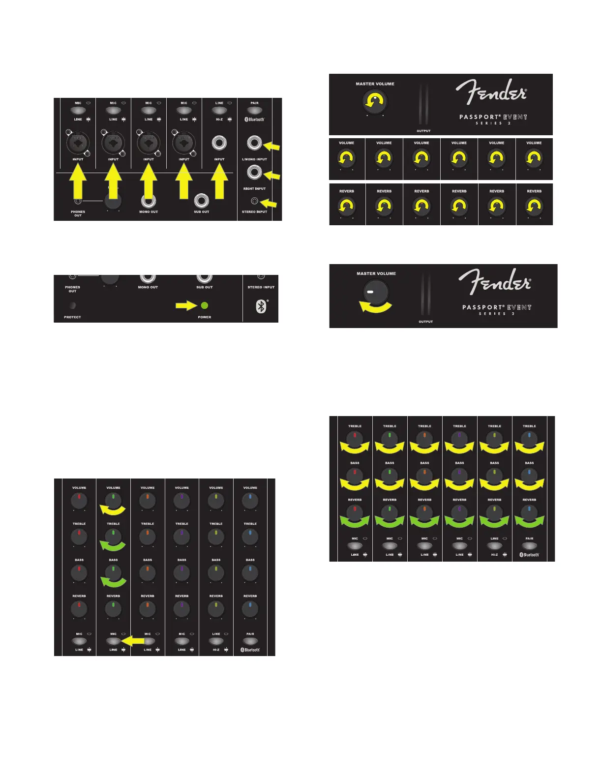 escucha. Los controles REVERB (flechas verdes) no tienen