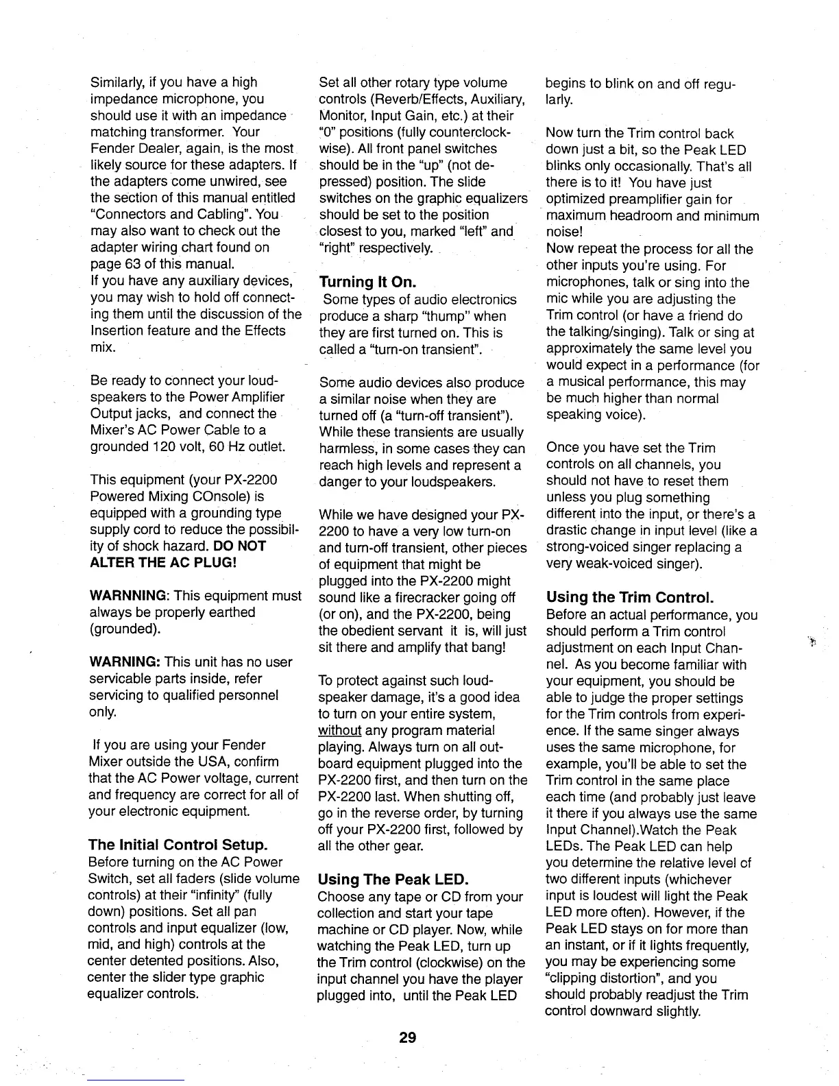 Fender PX-2208 - The Initial Control Setup; Turning It on; Using the Peak LED; Using the Trim Control