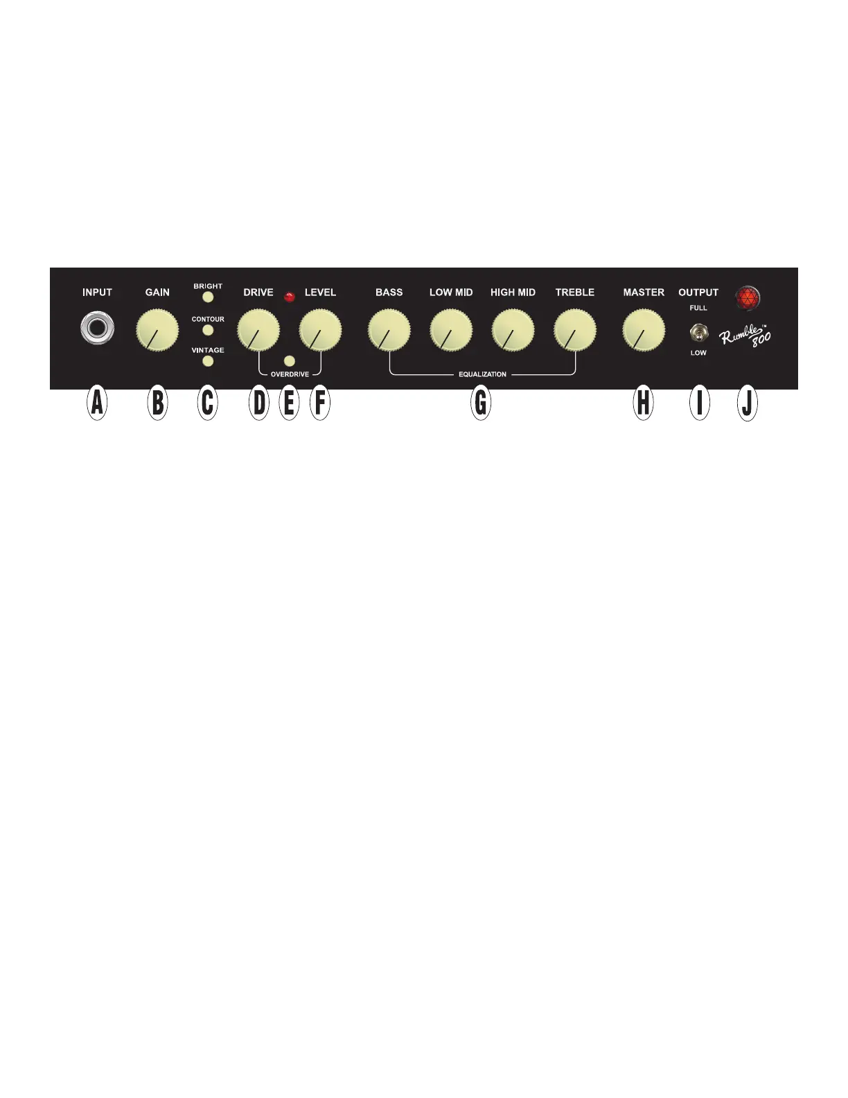 H. MASTER(マスター):アンプの全体的な音量を調節します。マス