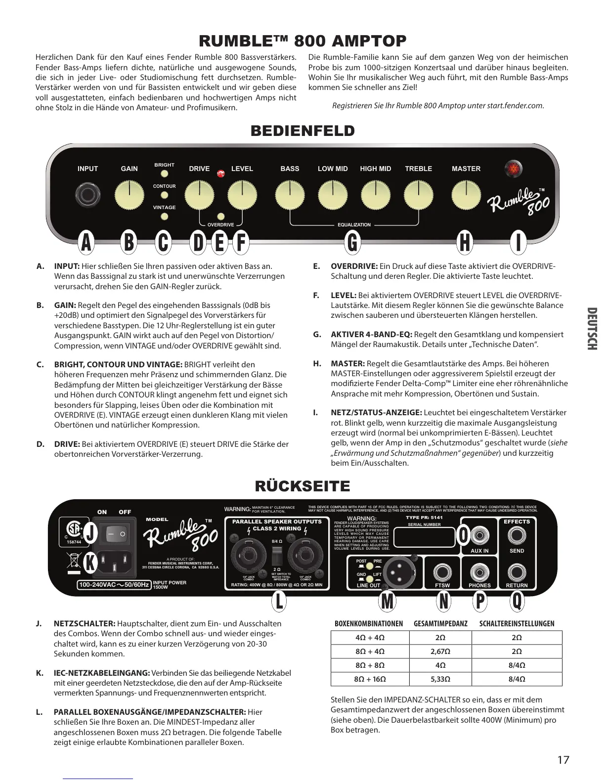 Herzlichen Dank für den Kauf eines Fender Rumble 800 Bassverstärkers.