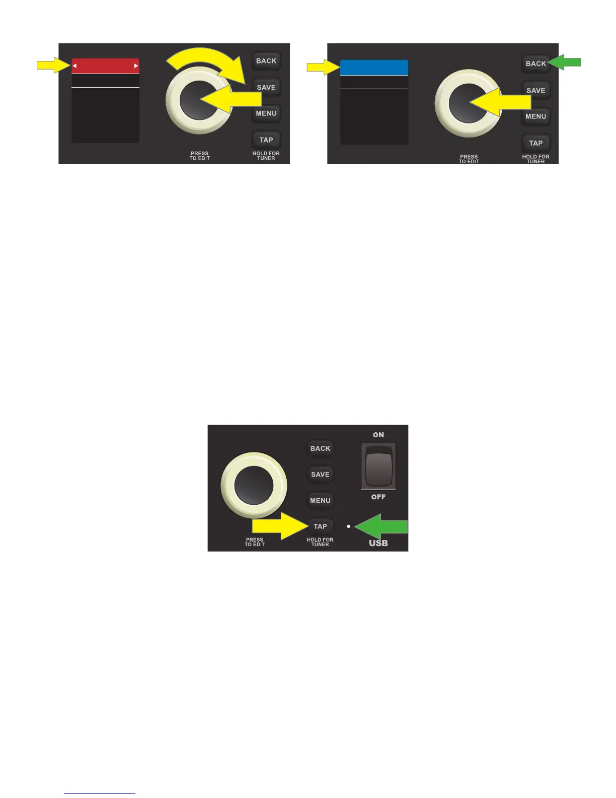 The second way is to use Rumble LT25’s TAP utility button (yellow arrow). If a preset includes a delay eect, the