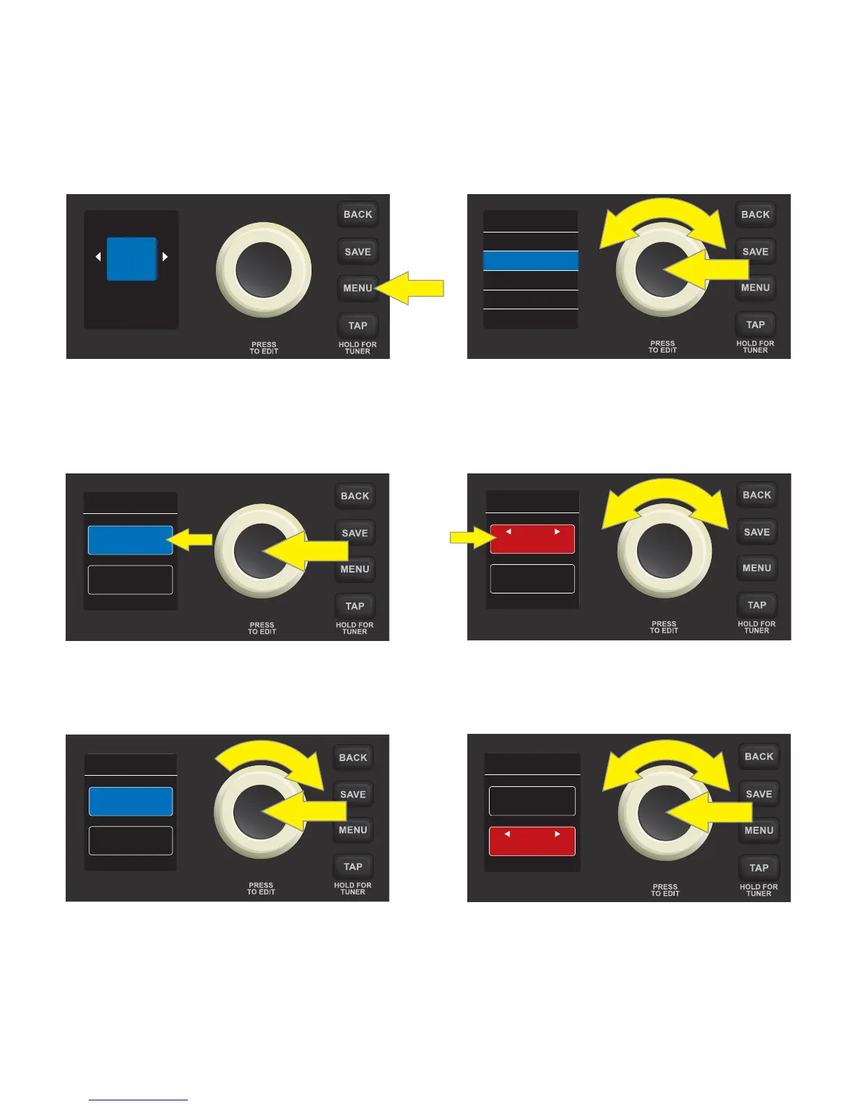 presets for quick-access footswitch use. To do this, press the MENU utility button, then use the ENCODER to