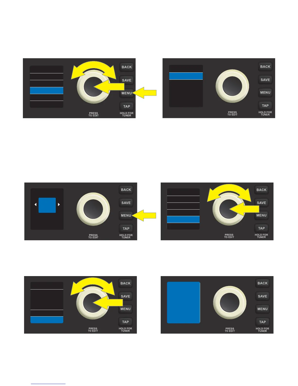 tings. To do this, press the MENU utility button, then use the ENCODER to scroll to and select RESTORE: