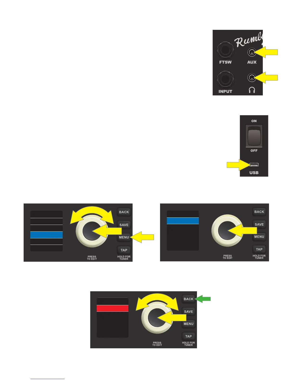 ENCODER to scroll to and select SETTINGS; “USB GAIN” will automatically be highlighted. Press the ENCODER on