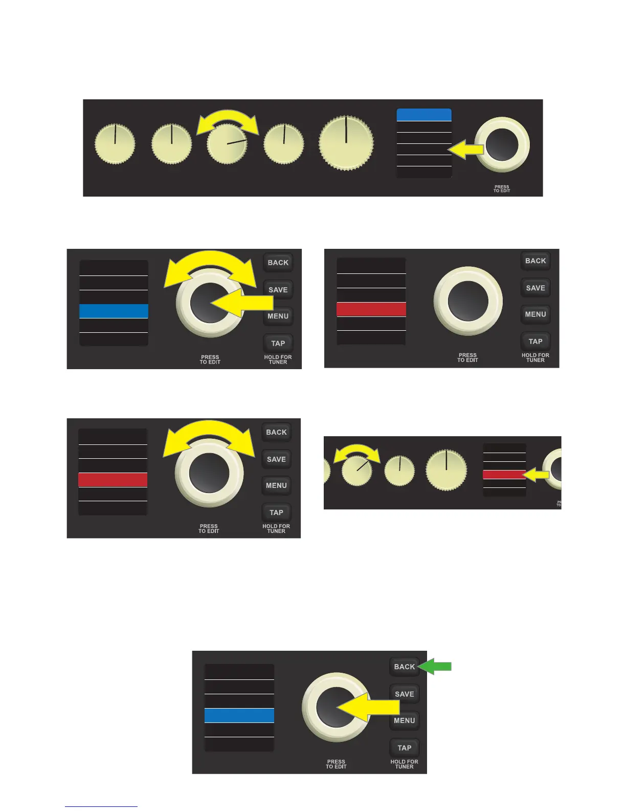 At this point, press the ENCODER or the BACK utility button (green arrow) to accept the adjusted control val-