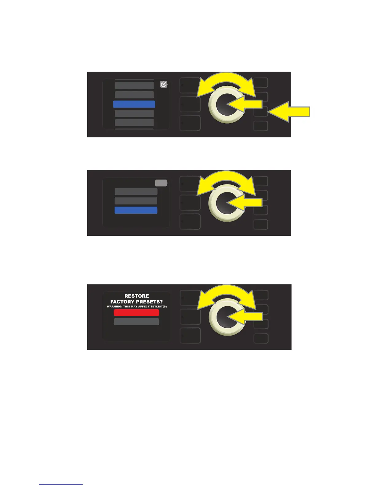 Use the ENCODER to scroll to and select the “RESTORE PRESETS” option (see illustration below).