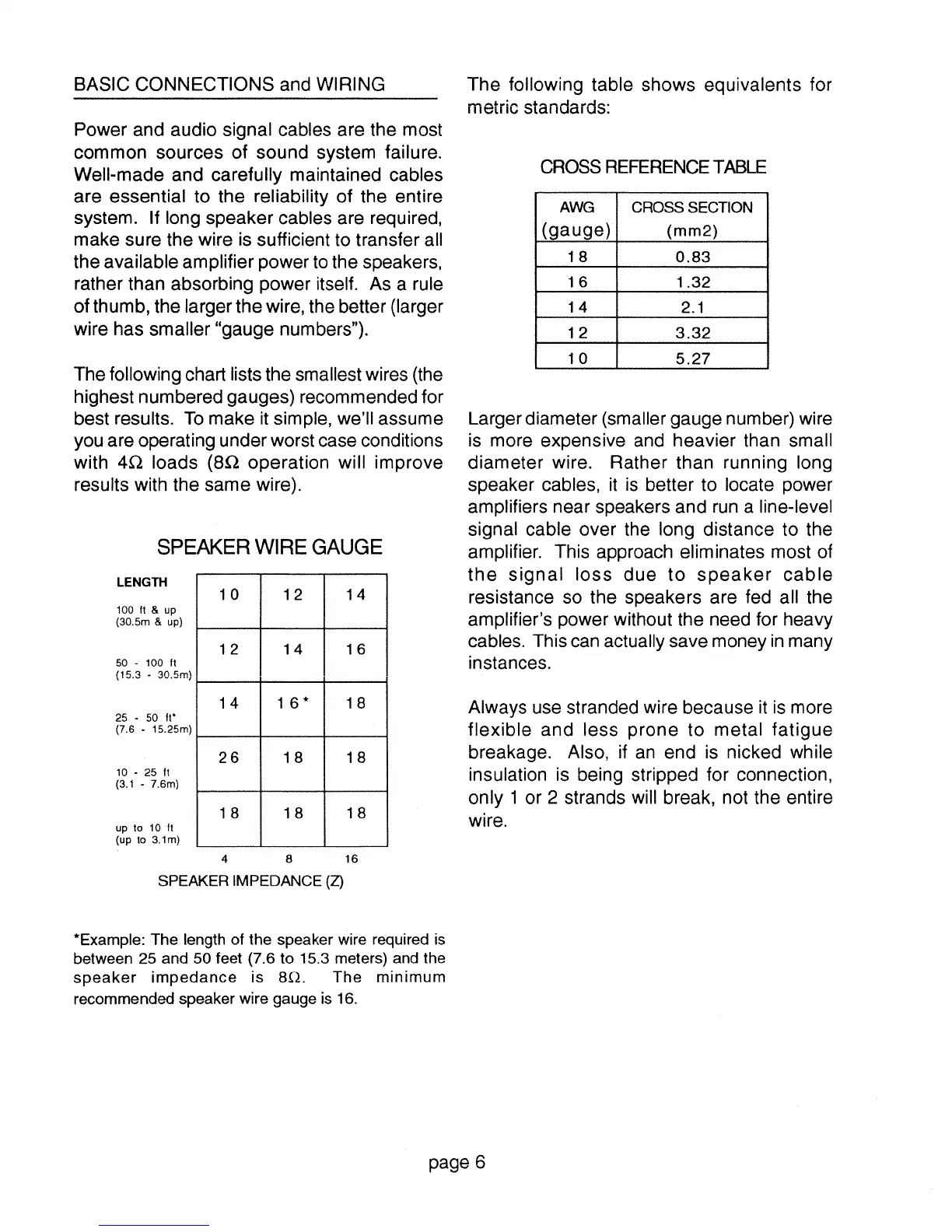 Fender SPA-13000 - Basic Connections and Wiring; Cross Reference Table; Speaker Wire Gauge; Speaker Impedance