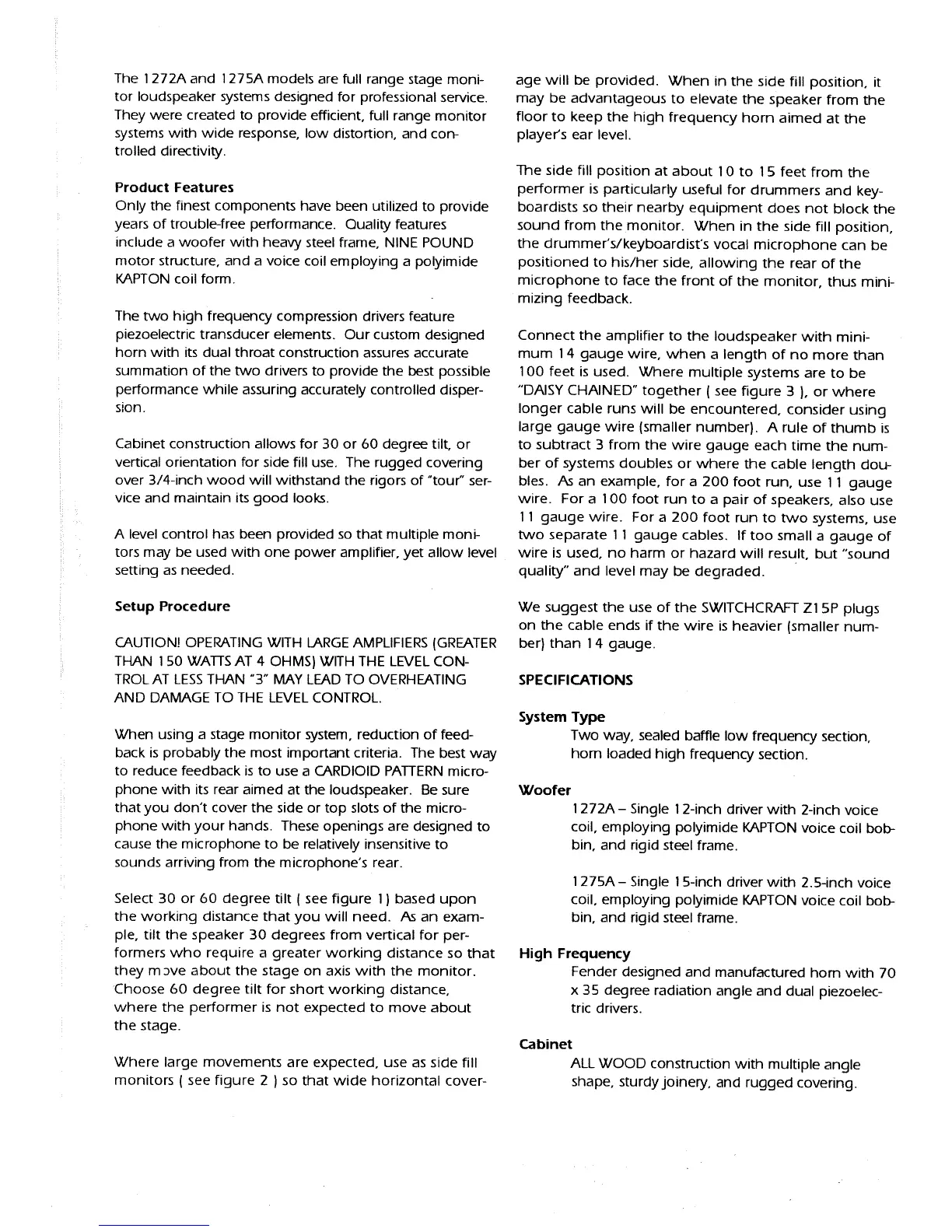 Fender SPL 1272A - Product Features; Setup Procedure; Speaker Tilt Angle Adjustment; Side Fill Monitor Placement