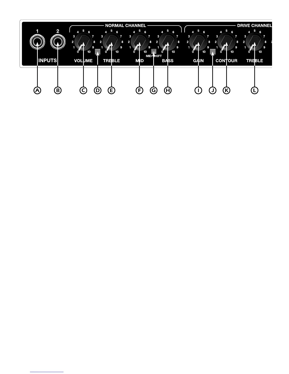 F. MID - Adjusts the amount of mid frequency boost or cut in the