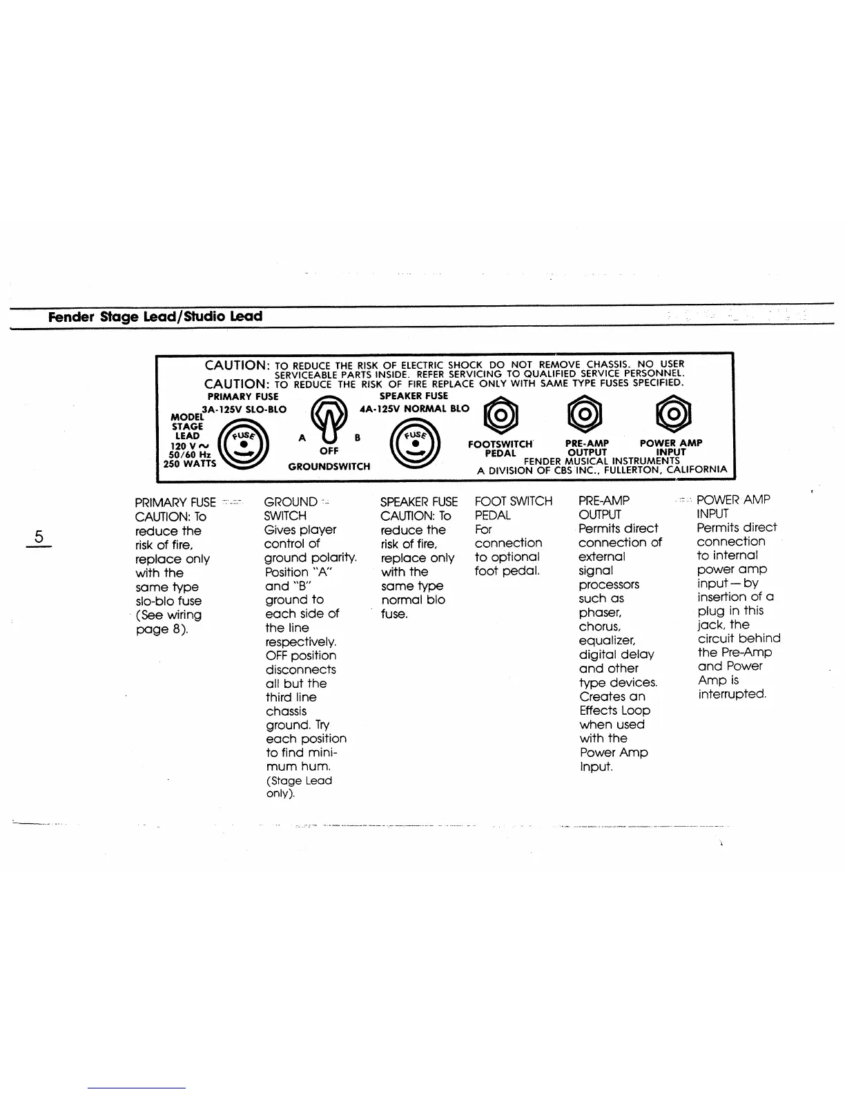 Fender Studio Lead - Rear Panel Jacks and Fuses; Fuse Types and Replacement; Ground Switch Operation; Connectivity Jack Functions