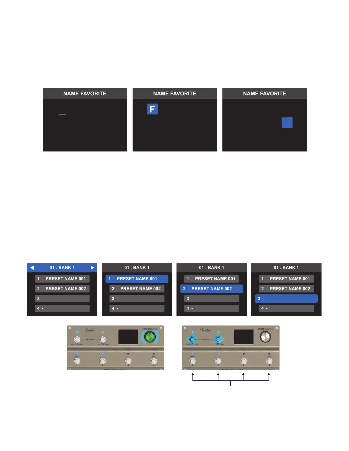 To rename the favorite, use the encoder or footswitches to scroll through and select up to 15 characters. When
