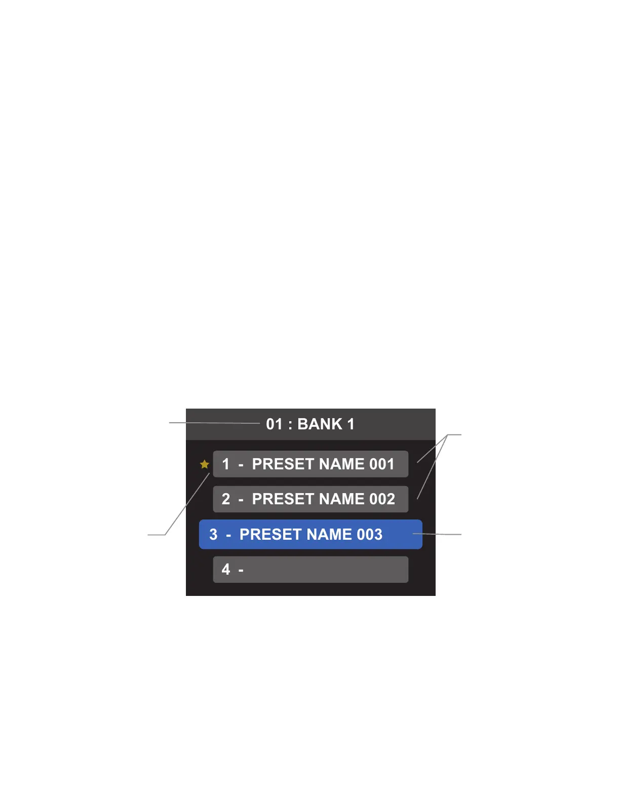 will show the user-generated preset name, while empty preset slots remain empty of text. Favorites are indicated