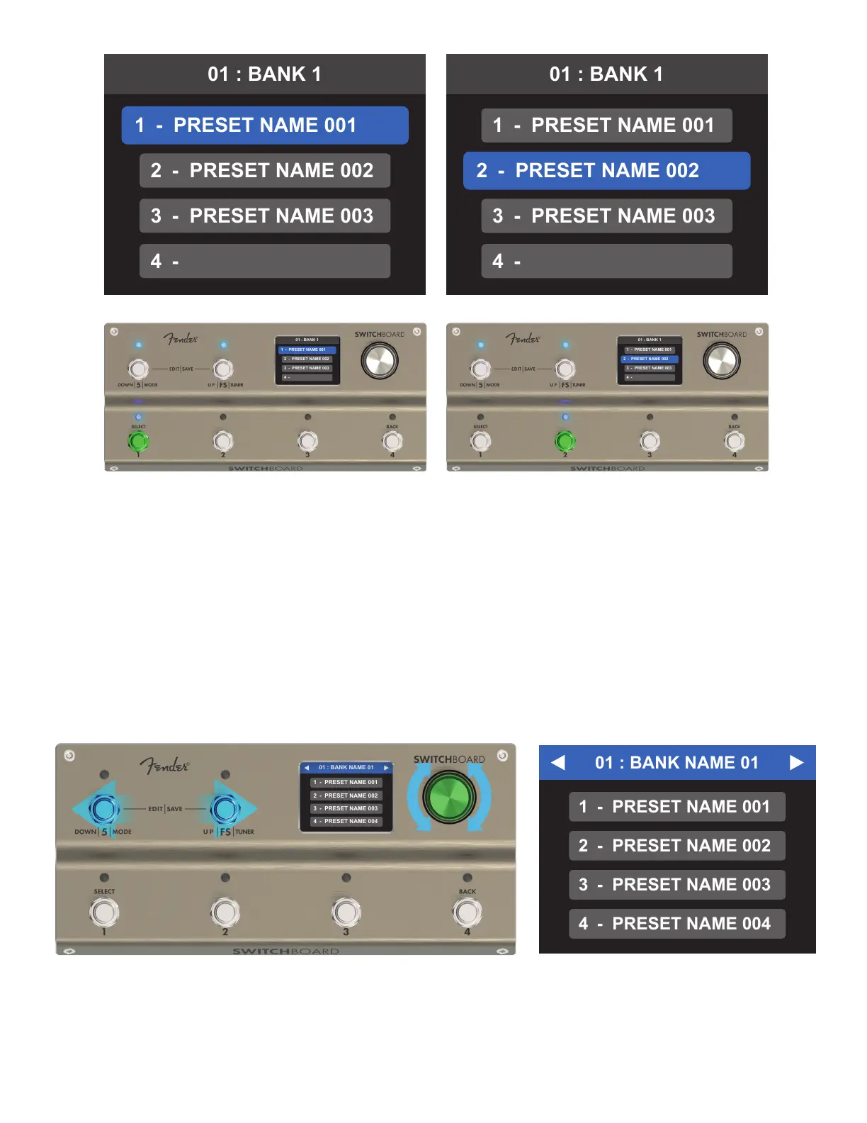 tive preset will remain active until a new preset is selected. The bank scrolling screen and footswitch LEDs will