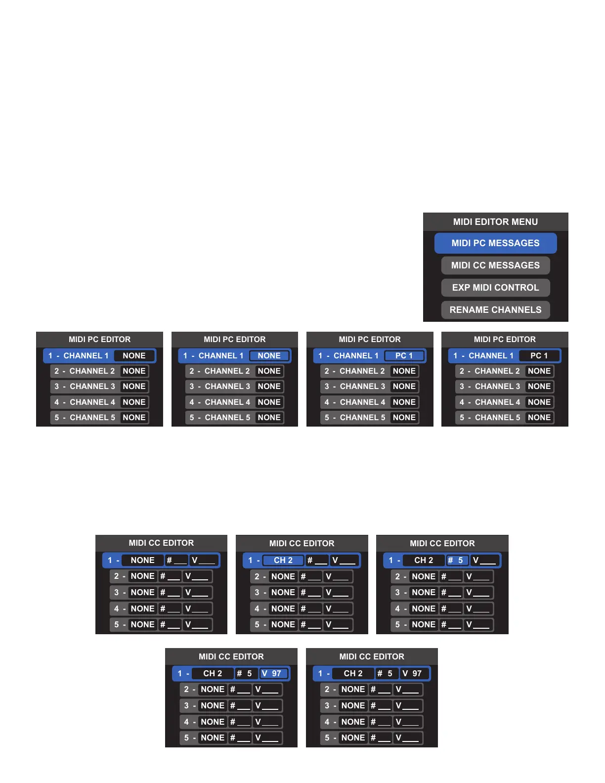 and edited using the MIDI EDITOR. Use the encoder or footswitches to navigate the MIDI EDIT MENU and select the