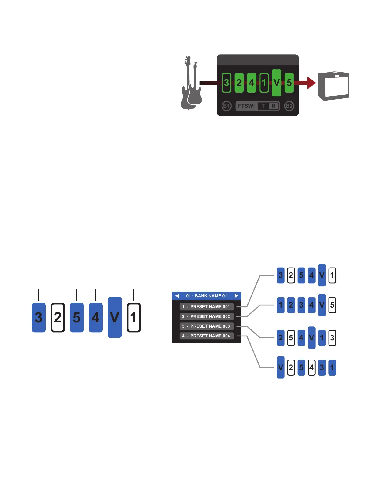 scrolled through using foot controls in Bank Mode. Recalling presets lets the player rearrange the signal path
