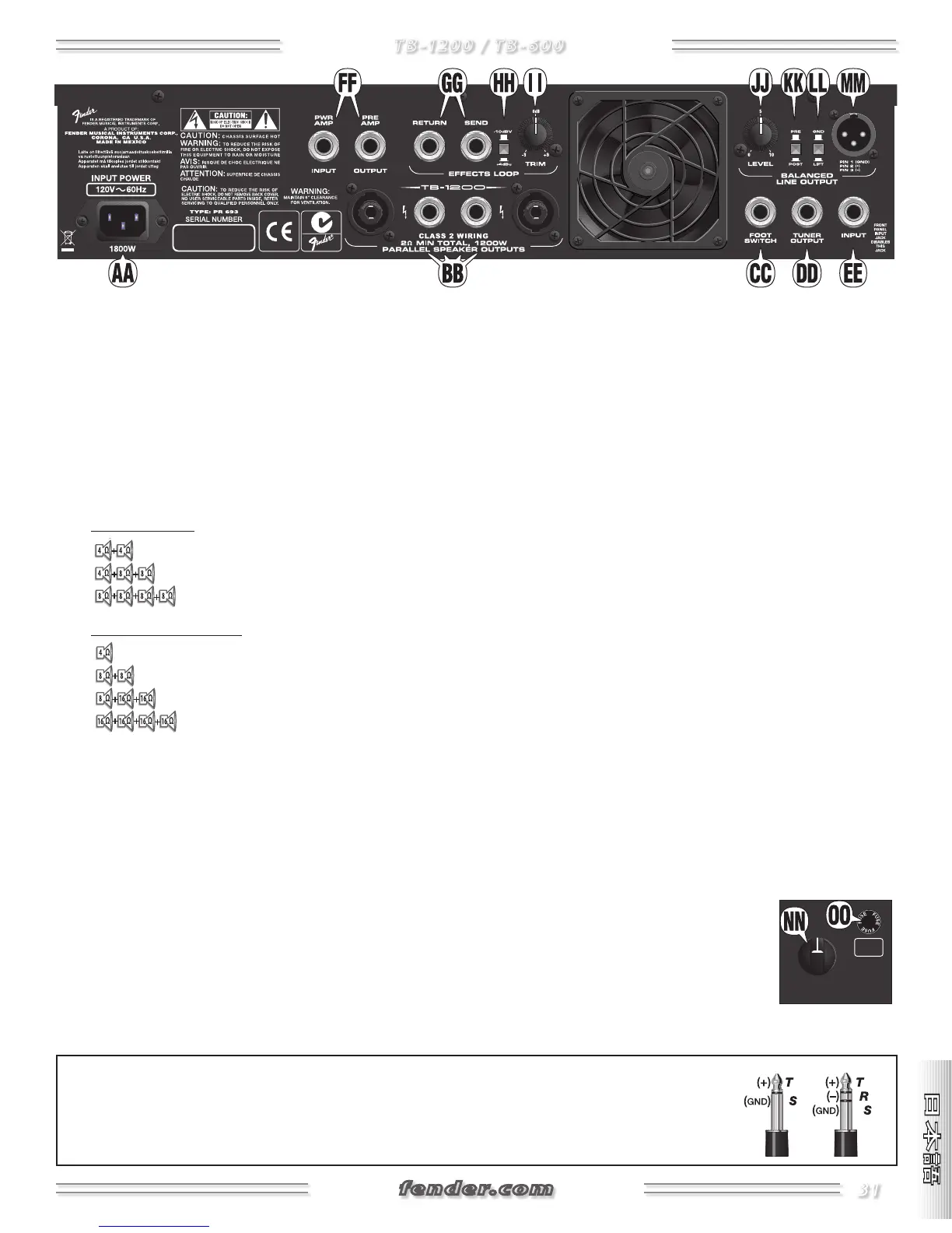 NOTE: {DD} {GG} {FF} のジャックは、Tip(チップ) = positive(+)、Ring(リング)= negative(−)、Sleeve(ス