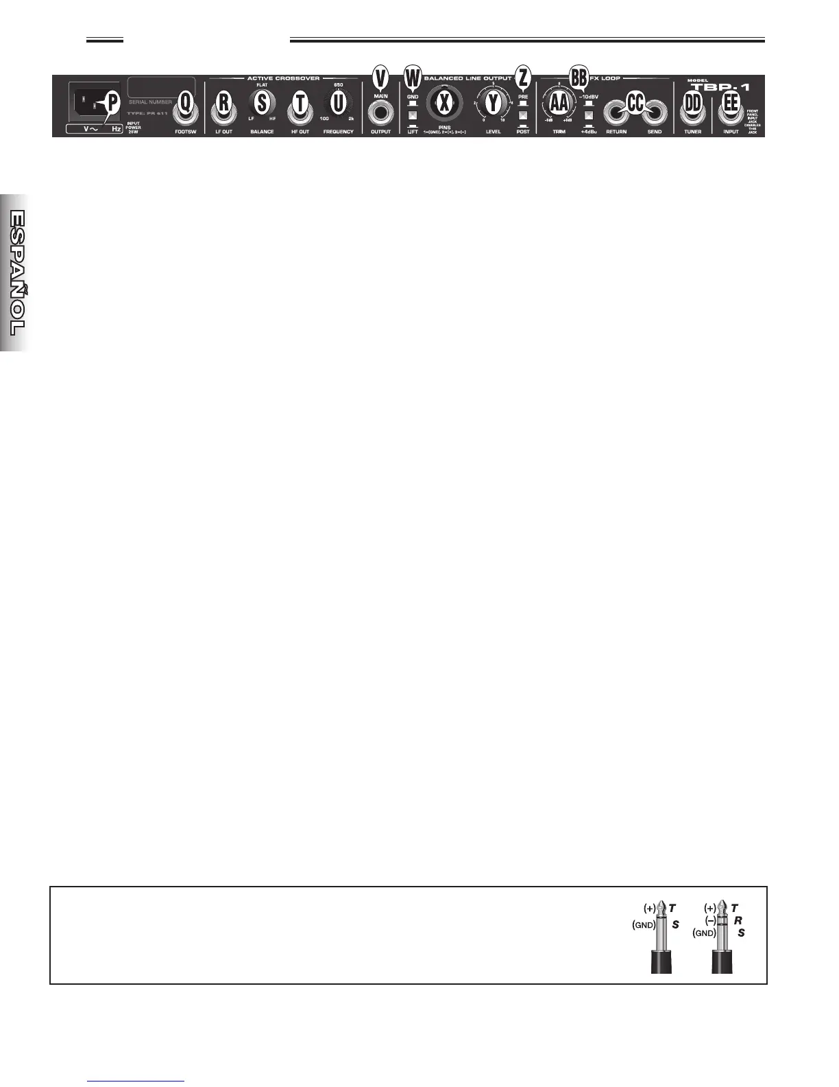 NOTA: Los conectores {R}, {T}, {V}, {CC} y {DD} son del tipo TRS (punta/anillo/lateral) balanceado,