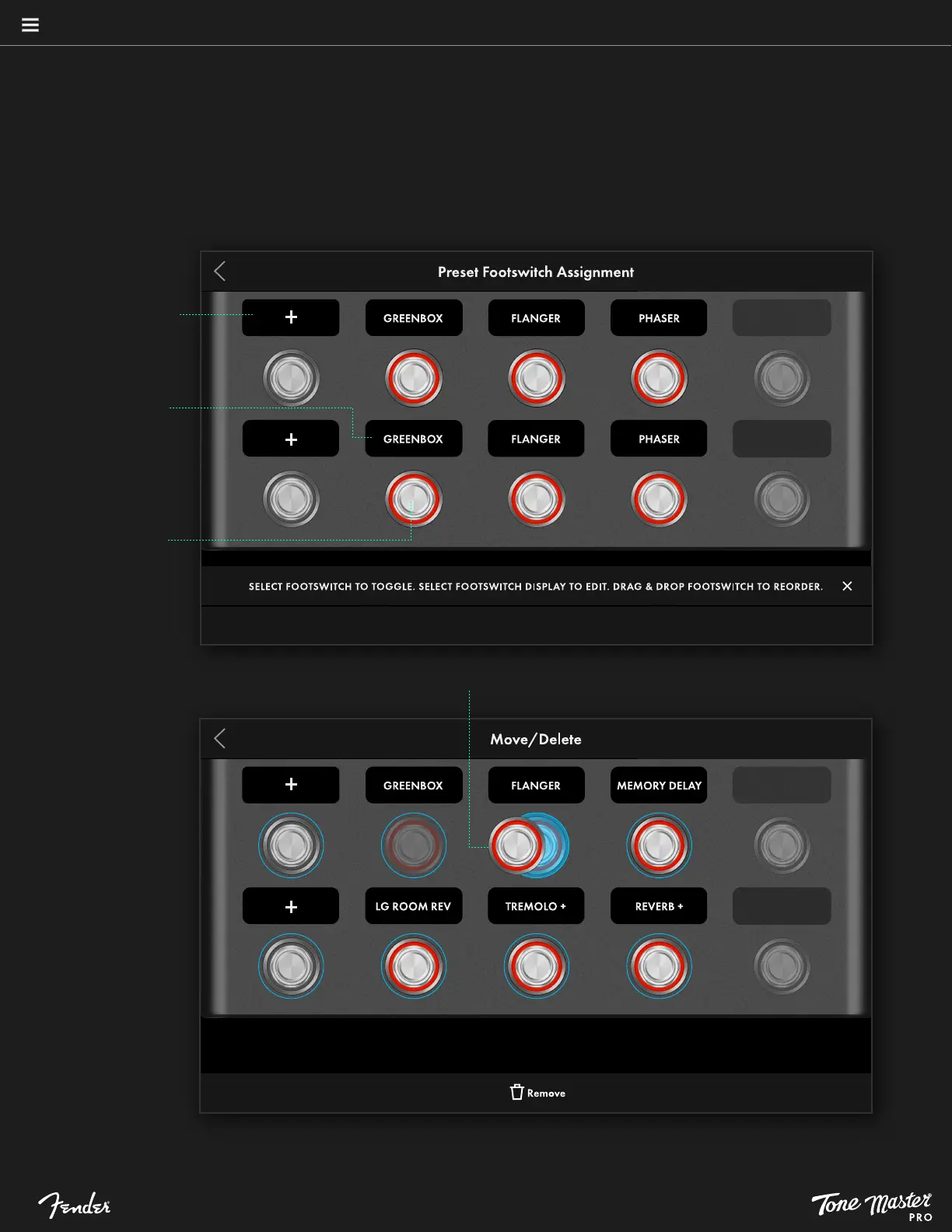 Drag-and-drop a footswitch assignment to swap or replace with another footswitch; remove an assignment by drag-and-drop to bottom of screen: