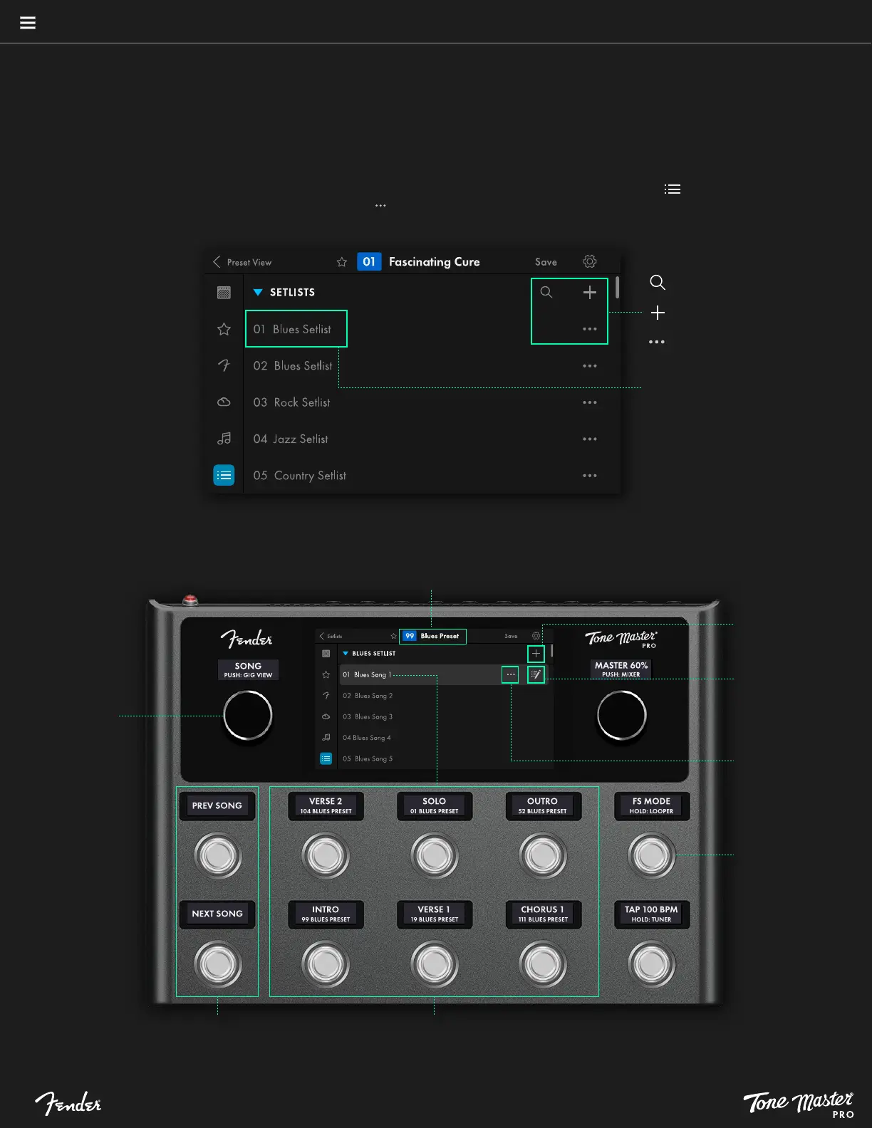 A Setlist is a group of Songs to be played together in a specific sequence. The user can create and name up to 50 setlists, with up to 99