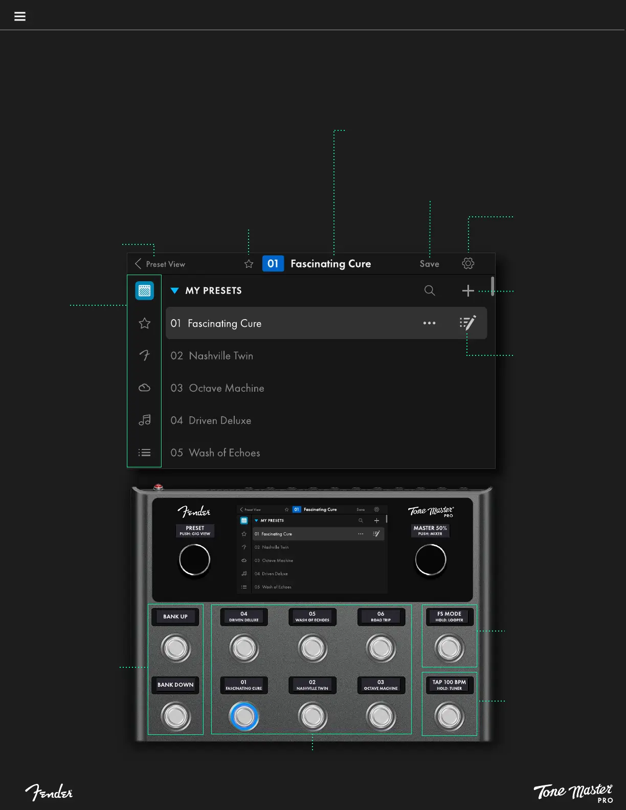 Tone Master PRO features and functions are easily navigated by using its six different modes—My Presets, Favorites, Factory Presets, Cloud Presets, Songs and