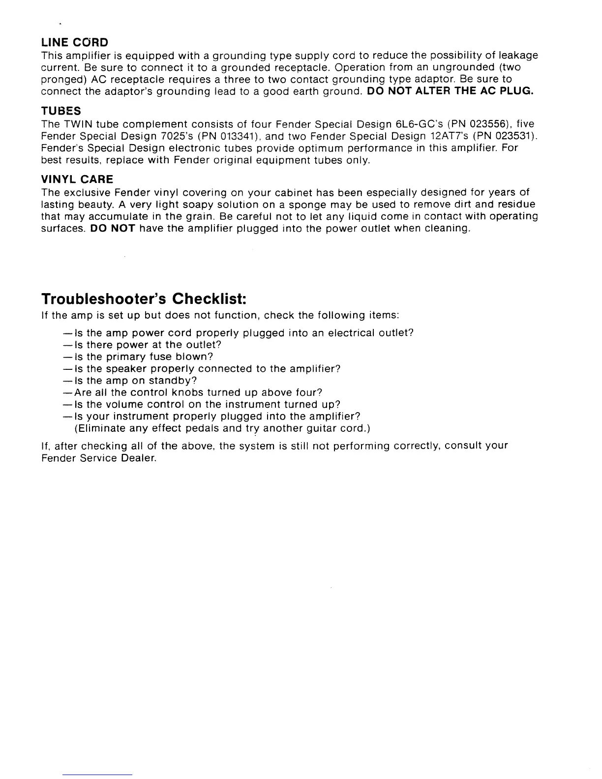 Fender TWIN - Troubleshooting and Maintenance; Line Cord and Grounding; Tube Complement; Vinyl Care