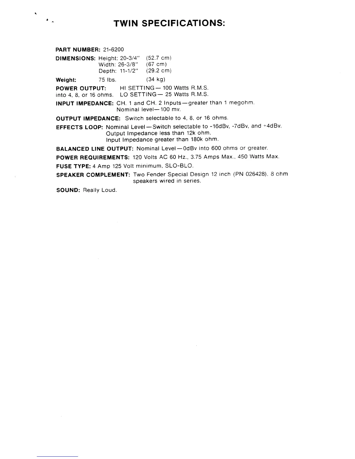 Fender TWIN - Twin Specifications; Part Number and Dimensions; Weight and Power Output; Input and Output Impedance