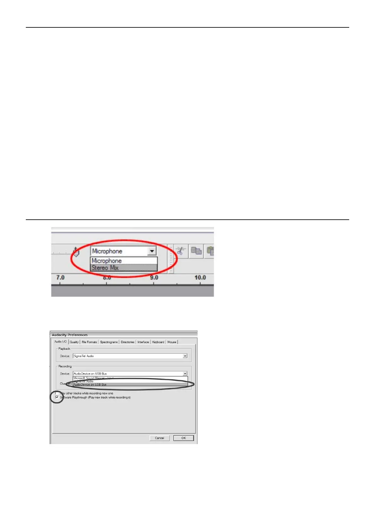 Select the USB audio device under the “Recording” selection as shown. Select “Software Playthrough” to hear the