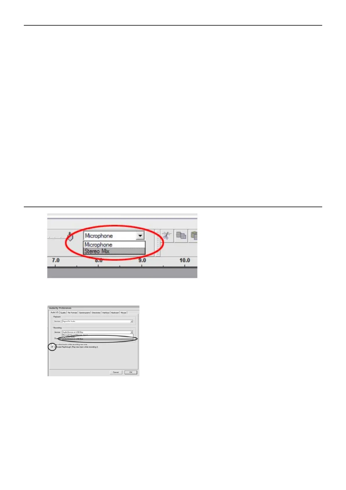 Selecteer het USB-audioapparaat onder de selectie “Recording” zoals afgebeeld. Selecteer “Software Playthrough” om